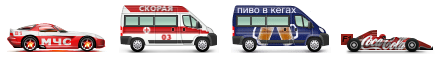 Применяются аэрографии, превращающие клавогоночный транспорт в машины скорой помощи, МЧС или автомобили с рекламой.